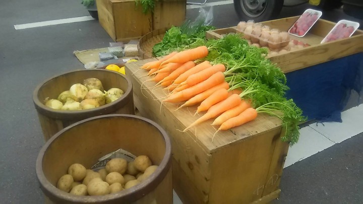 有機野菜や果物や卵がお店の前に並んでいて、どれもおいしそうな色合いでした。
