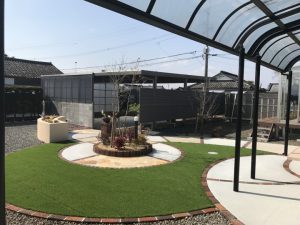 床面はコンクリートと洗出し、自然石、レンガの組み合わせです。