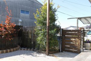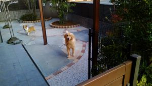ワンちゃんがお庭から飛び出してしまわないよう、既存の扉はそのまま利用し、周りはメッシュフェンスで囲いました。