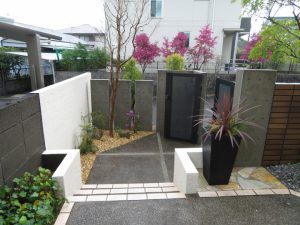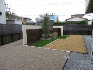 広いお庭ですが、あえて遊びのある飾り壁を設け、お隣様への目線を隠し石張りの花台には