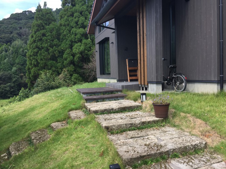 涼しい雰囲気を演出、階段の踊り場は階段と同じ加治木石を設置しました。