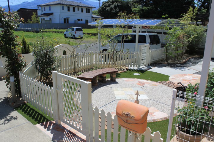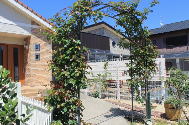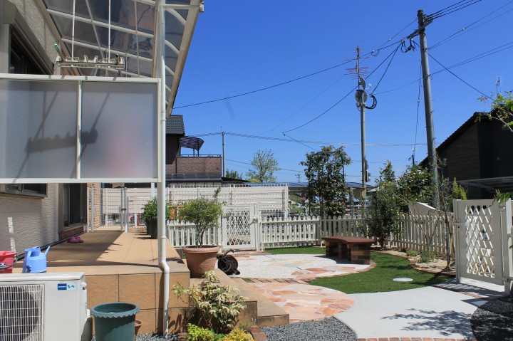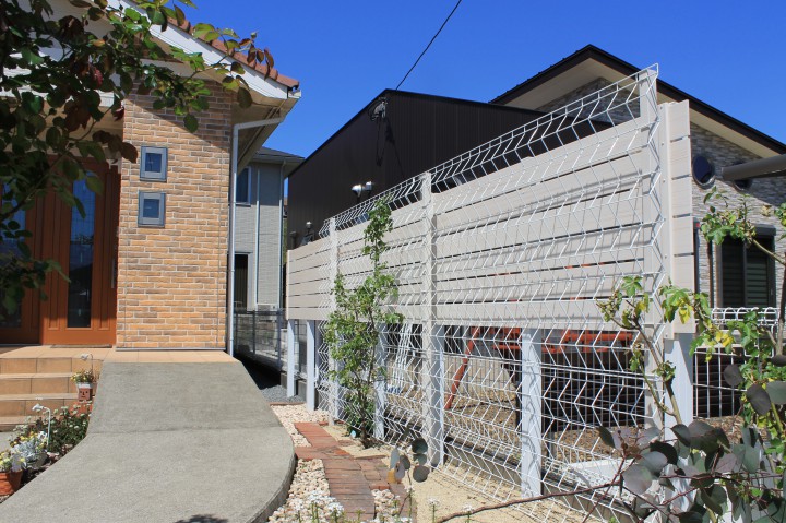 境界部分には樹脂製の目隠しフェンスと、奥様が大切に育てていらっしゃるツルバラ用のメッシュフェンスを設置しました。