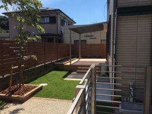 庭を囲いました。また、タイルテラスや屋根、開閉式の日除けを取り付けることで、