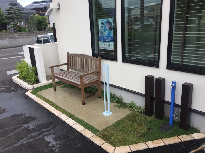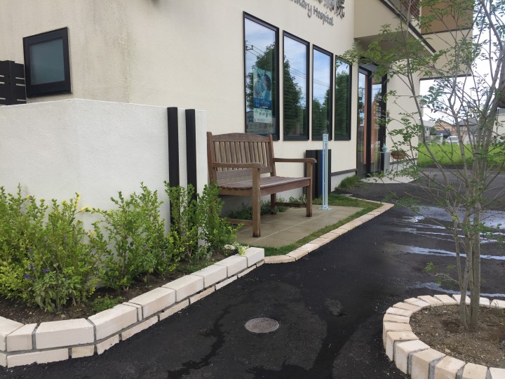 横の駐車場をアスファルトで拡張し、建物周りはベンチに座りお客様がお待ちできるスペースを作りました。