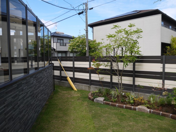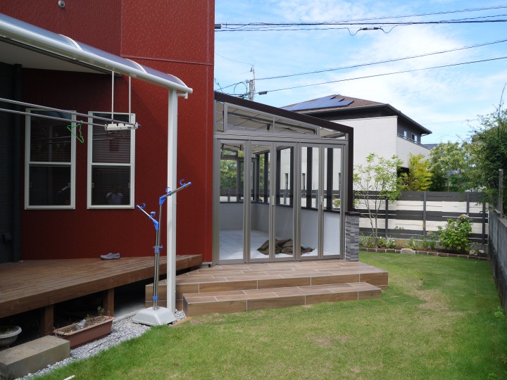 既存のデッキからのつながり出すために木目調のタイルを使っております。