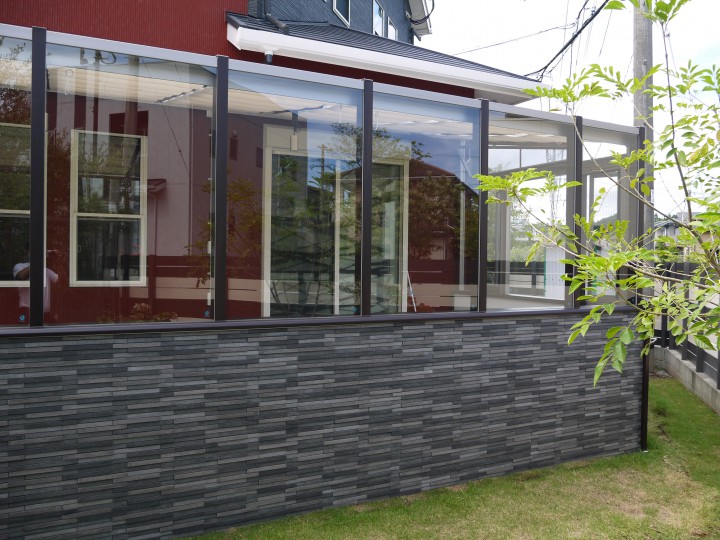 間口カットをして外壁いっぱいにルームを取り付けております。腰壁のタイルは2階の外壁の
