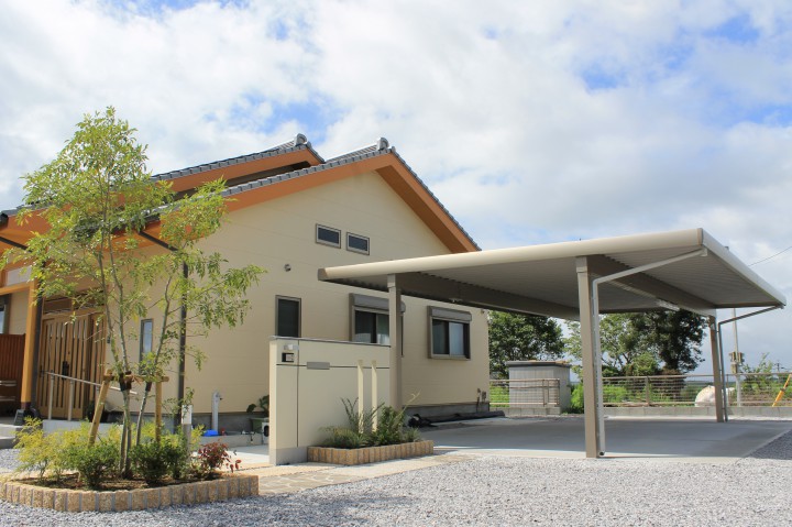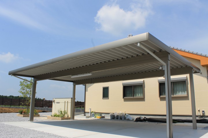 折板カーポートは風に強く、丈夫です。ライトも取り付けました。