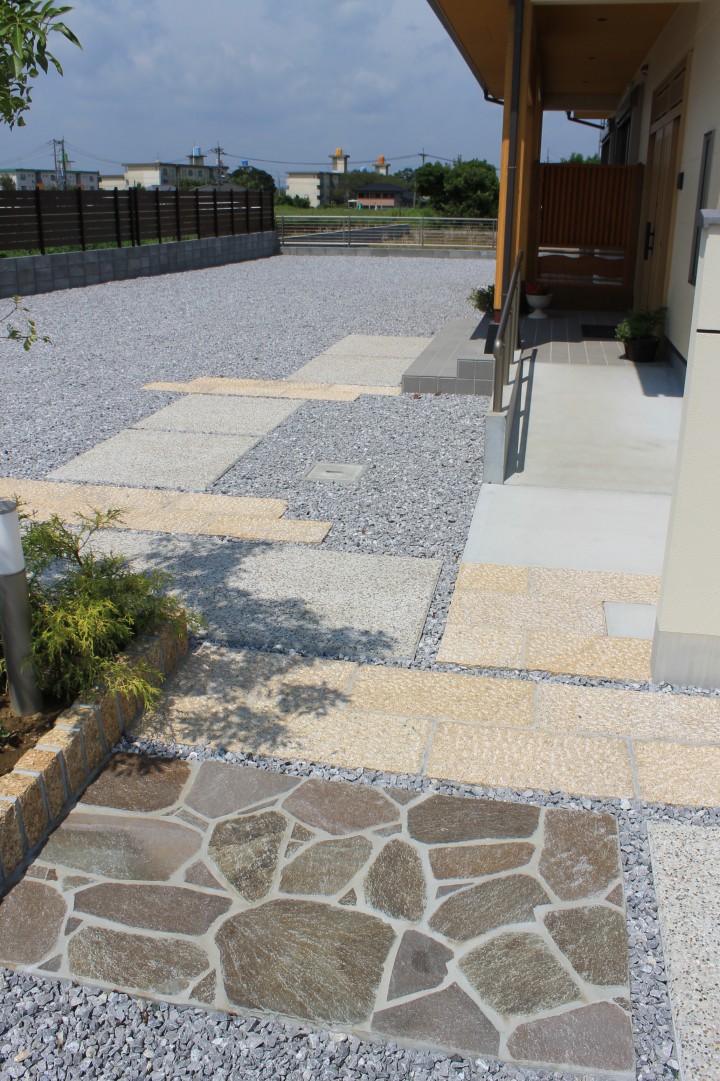 アプローチ部分は洗出し仕上と鉄平石、御影石の組み合わせです。