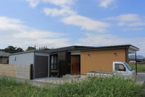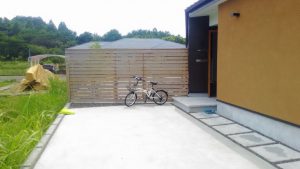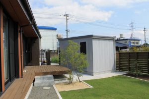 ボートを入れる物置は、板塀を一部撤去し、駐車場の奥に配置しました。