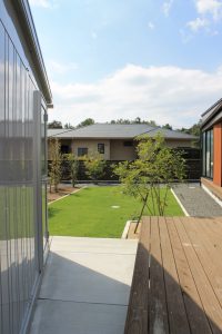 奥に樹木を列植し、手前に広く芝を貼りました。