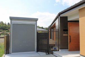 物置と建物の間は縦格子状の木調フェンスと扉を設置しました。