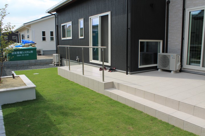 南側の庭にはタイルテラス、花壇、目隠しフェンスを設置。