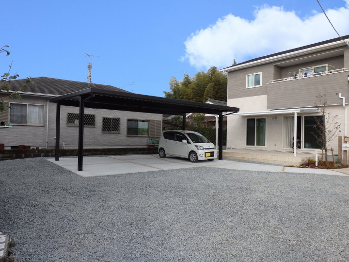 大きな白い屋根テラス(日除け付きなので、夏場も快適!)と黒の3台用カーポートは存在感があり、