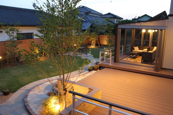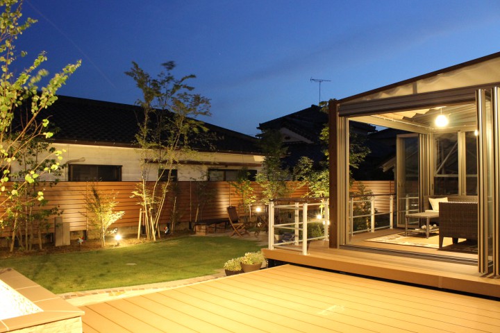ガーデンルームとデッキ、広々とした芝庭がダイナミックに配置された作品です。