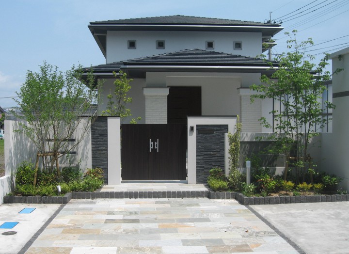 自然石を使った門塀やアプローチが生える、小林市 S様邸です。