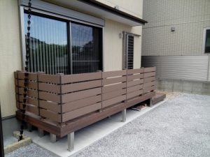 デッキは、駐車スペースとリビングの間にワンクッションとしてフェンスを設け、