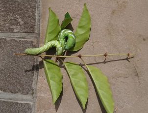 早速駆除。シマトネリコやオリーブにつくモモスズメガの幼虫です。