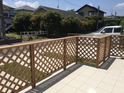 ワンちゃんが外に出ないように木調樹脂フェンスと門扉を付けました。