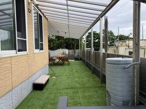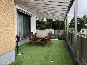 お庭には人工芝を敷きテラスの屋根にはライトがついてるので