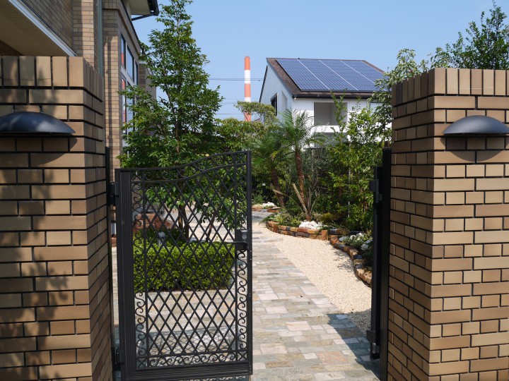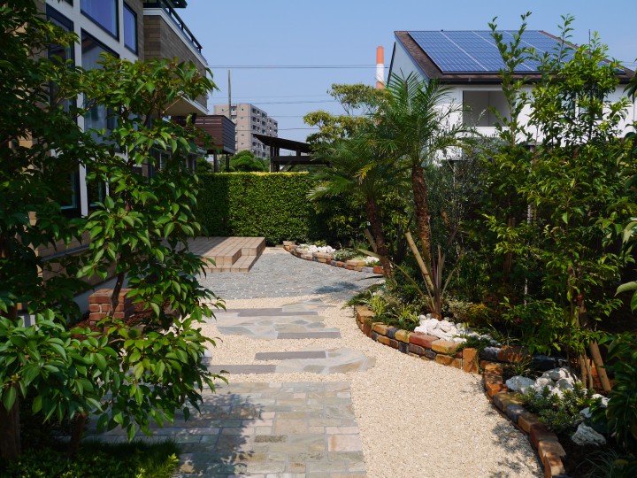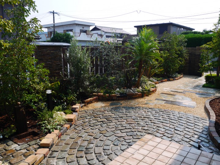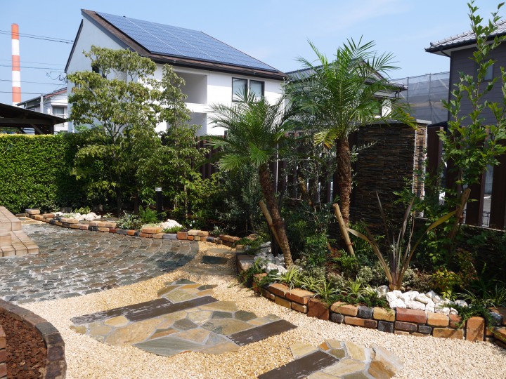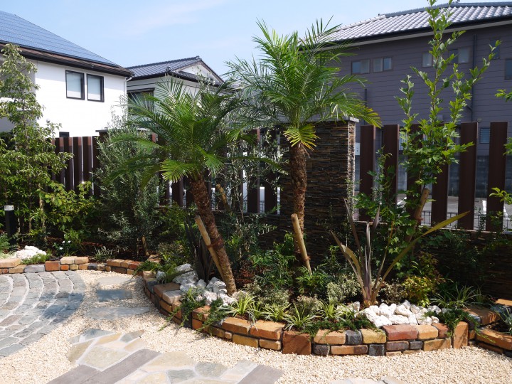 中央の花壇にヤシ類を入れる事によって全体が南国チックなイメージになりました。