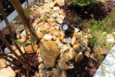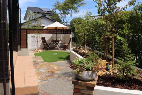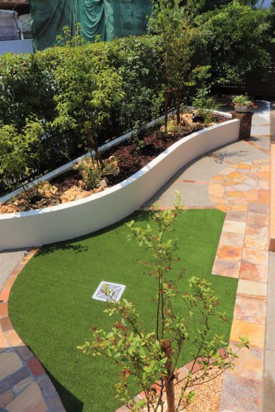 人工芝も交え、大小さまざまな植栽をバランス良く配置。