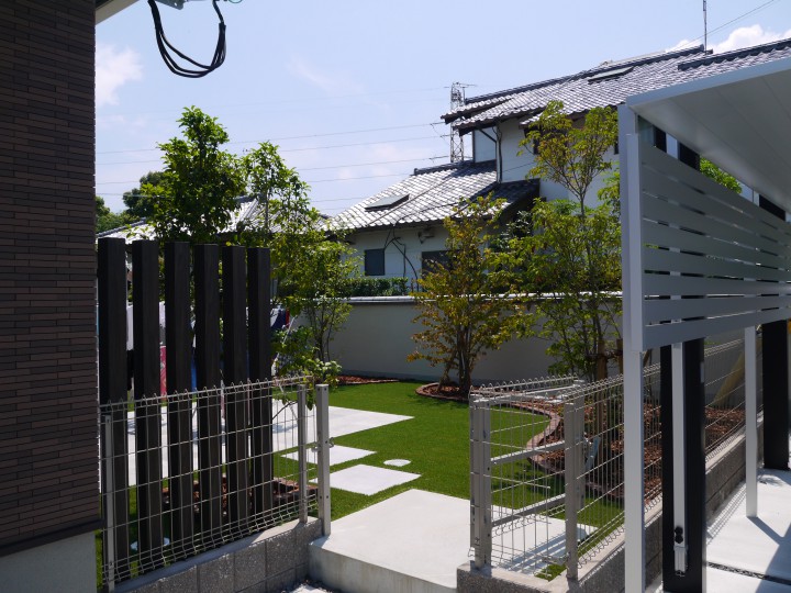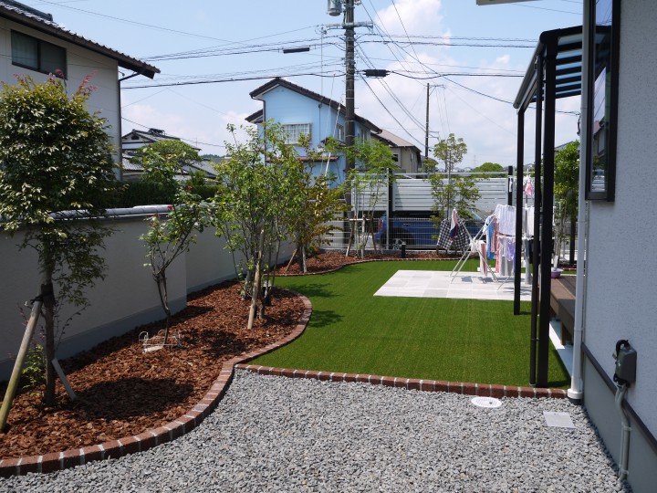 既存の樹木を活かしつつ、人工芝、土間タイルとお手入れの少ないお庭になりました。