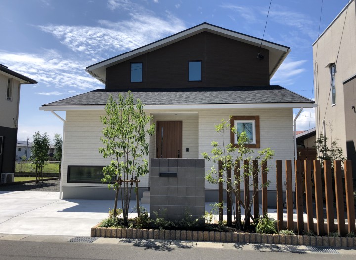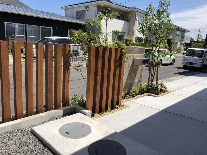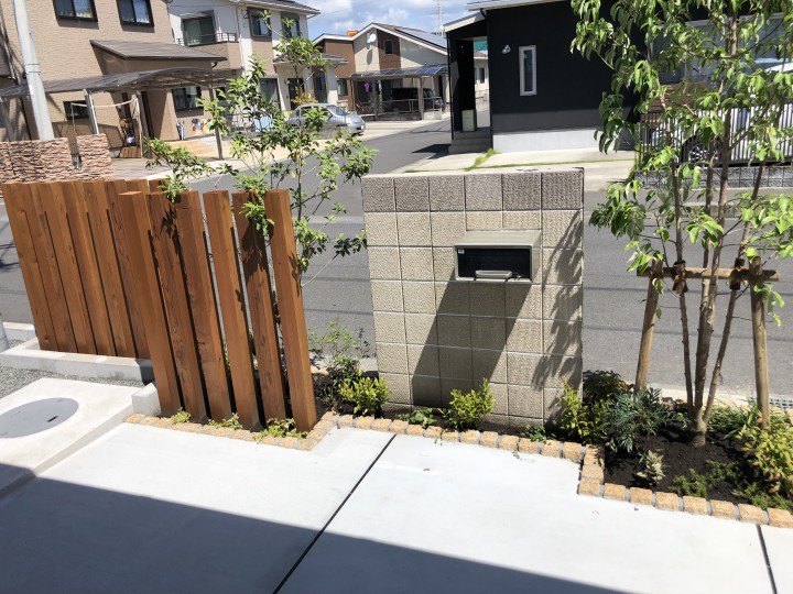 角材と常緑樹を中心に門回りをプラン、目線の高さも何度も車で通りチェックしましたので