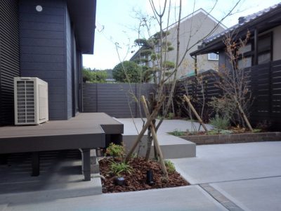 降りたところにタイルテラス。植栽に囲まれながら晩酌やBBQなども