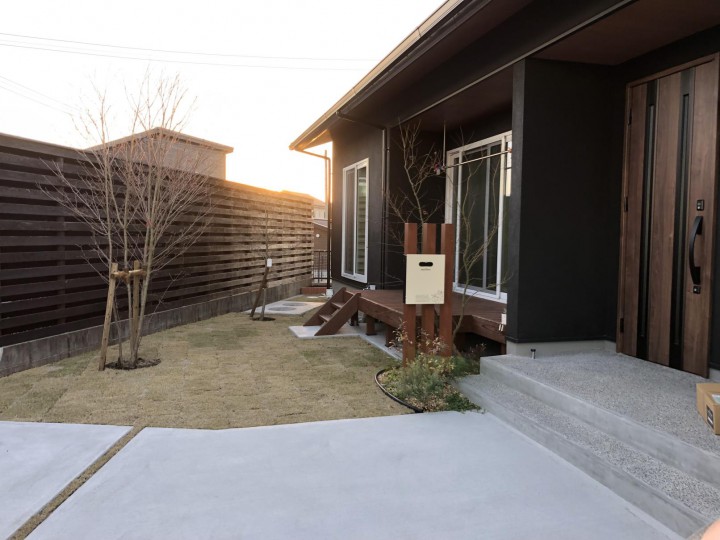 玄関周りはモミジ、ヤマボウシ、ハナミズキと落葉樹を植栽しました。