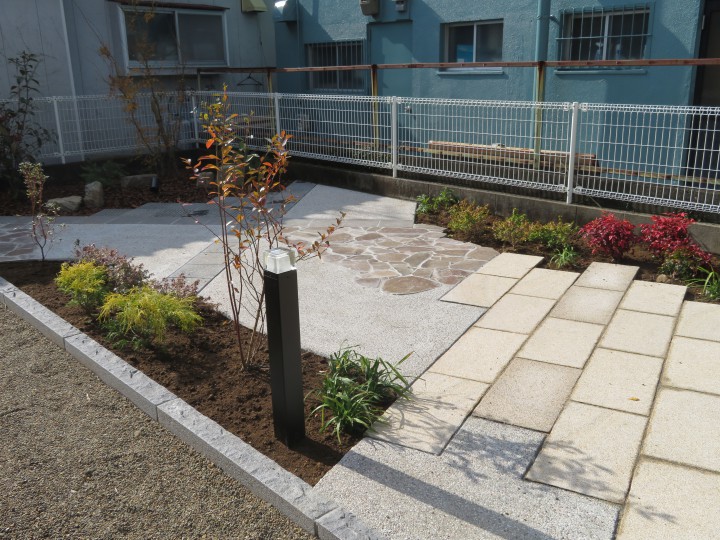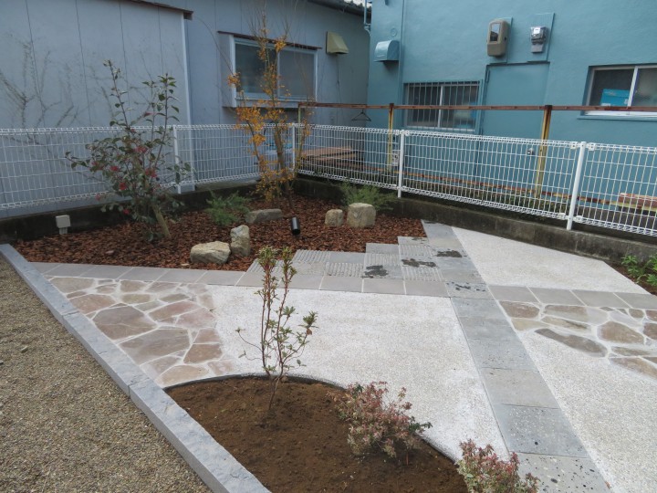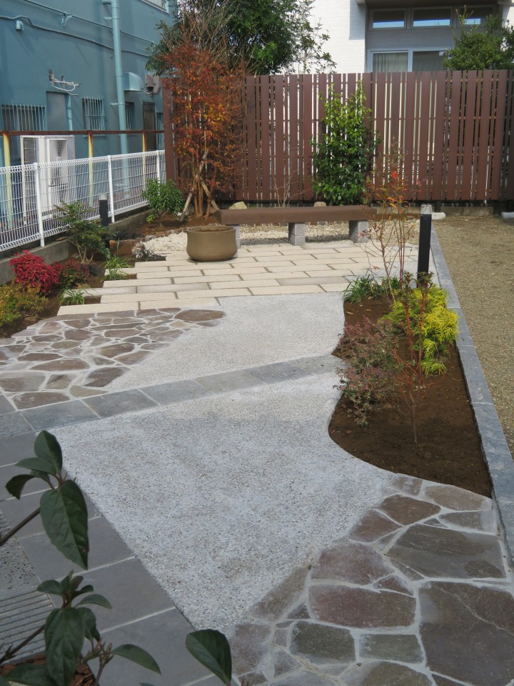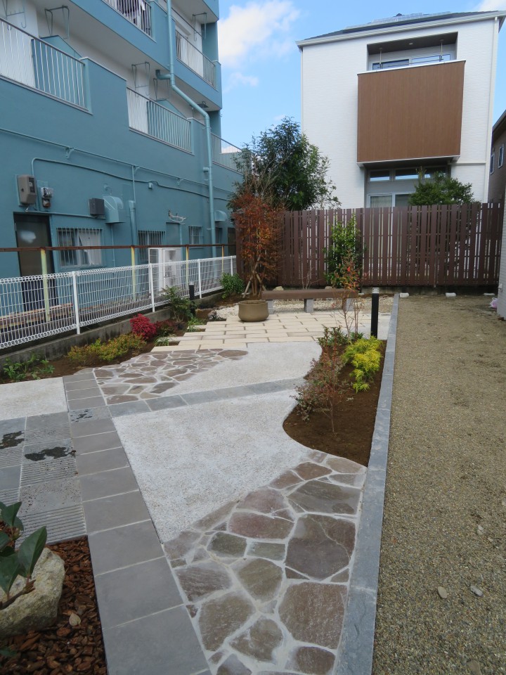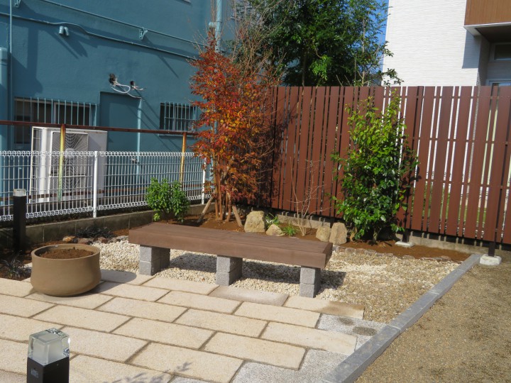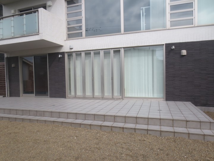 ↓こちらの石張りテラスにはガーデンファ二チャーを置かれるスペースです。