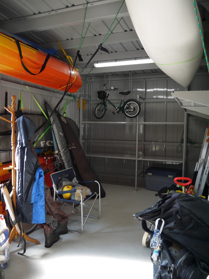 仕事場のガレージには、ご趣味のカヤックやサーフボード、自転車などを綺麗にしまい