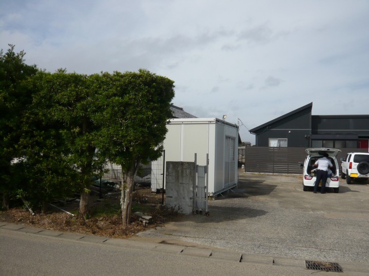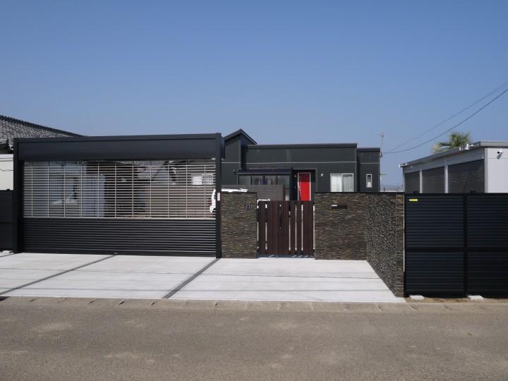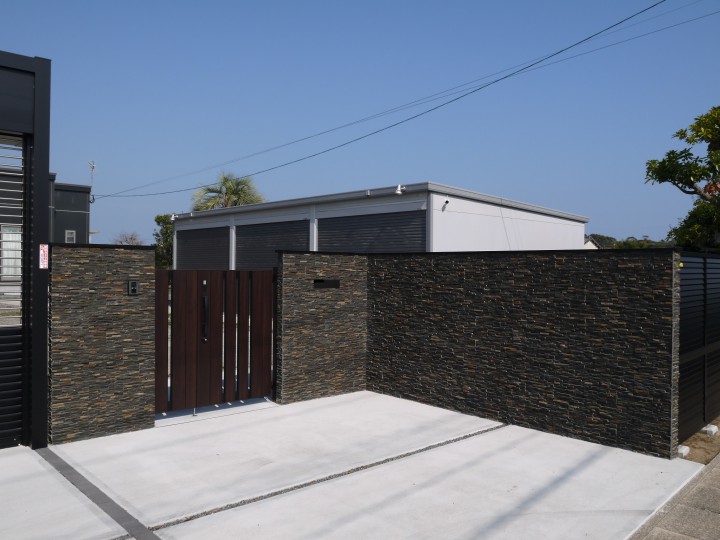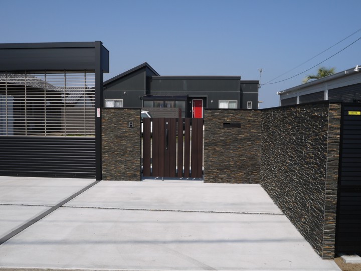 シャッター、フェンス、門扉、石張のPX門壁と乾式工法になっているので、工期短縮になっております。