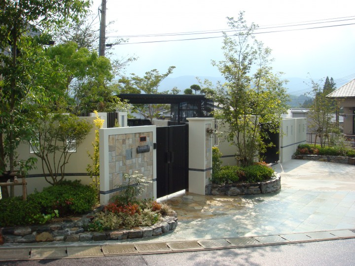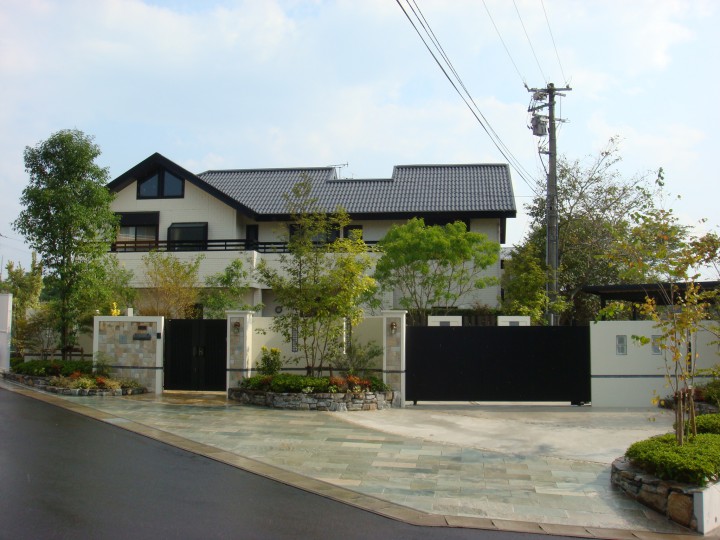 既存の門壁や植栽を活かし、連続性を意識したデザインはシンプルで落ち着いた空間を演出しております。