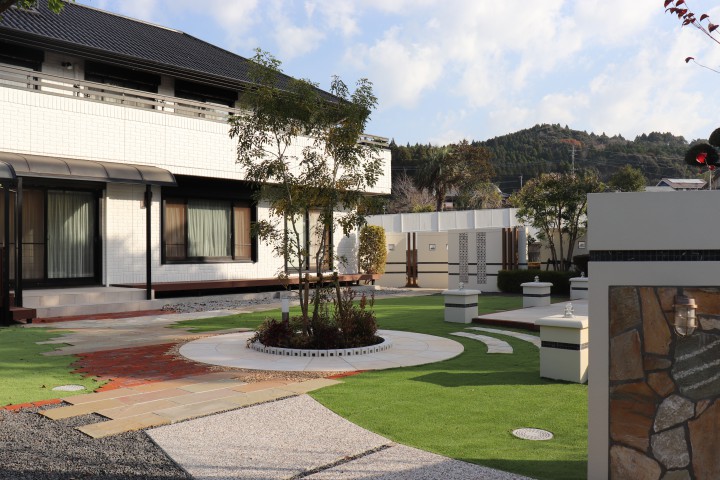 大きなタイルテラス・人工芝を中心に計画致しました。