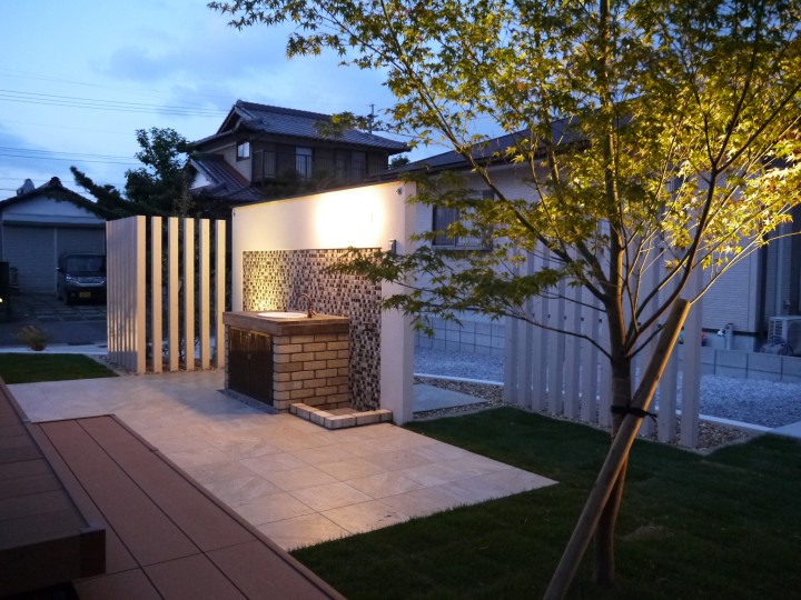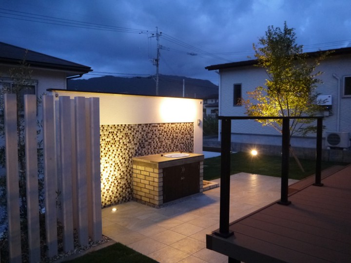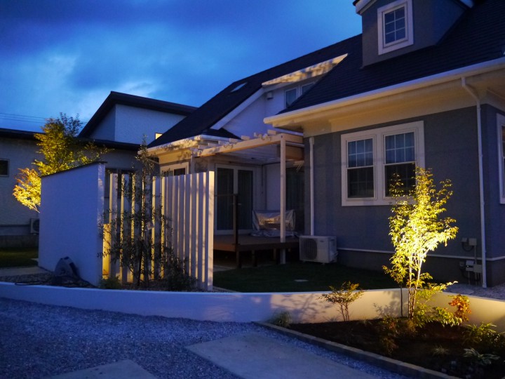 照明を多く取り入れ、バーベキュー用にとパーゴラにはスポットライトを取付け