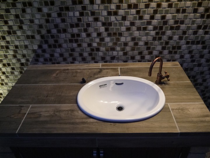 天板の木目調タイルは役物を使っているので、よりリアルな天然木に見えます。