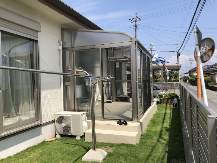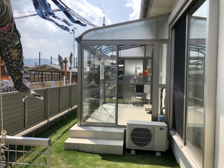 綺麗な芝のお庭に大きなサンルームが欲しい、洗濯物多いため標準より大きめの9尺タイプでご提案しました。