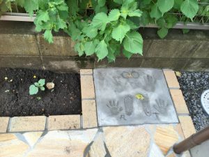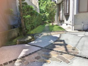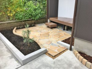 今度は明るい黄色の乱形石で玄関周りとお庭に彩りを与えてくれました!