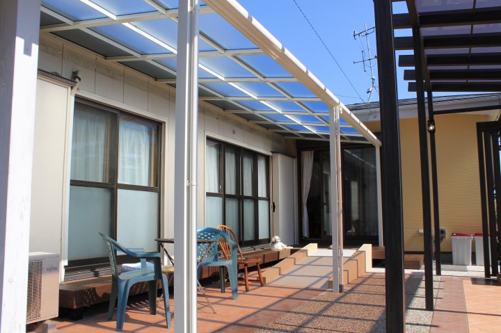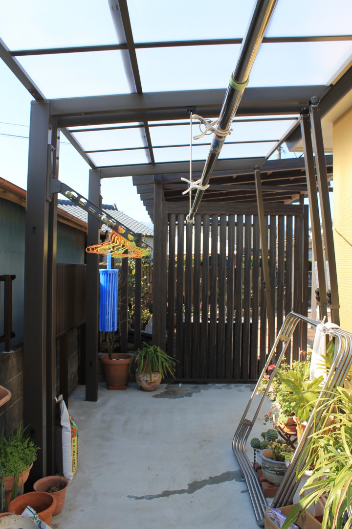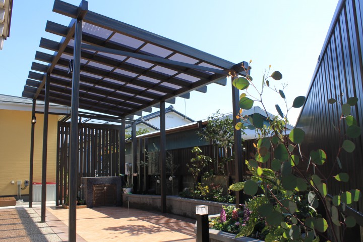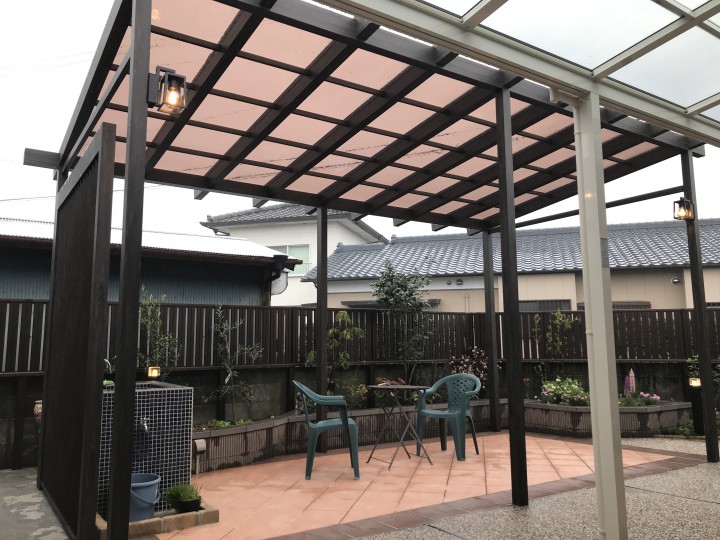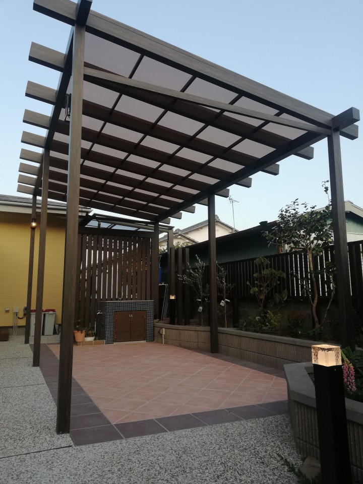 「お庭でお茶やバーベキューをしたい。」とのご要望もあり、パーゴラ風の屋根を設置しました。