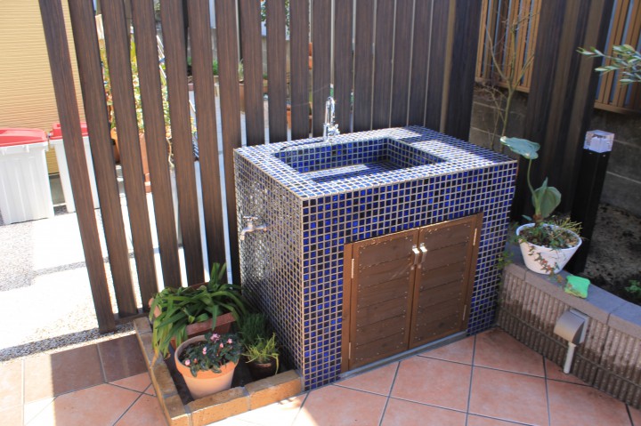 弊社オリジナルのガーデンシンクも作成しました。木製扉の中は収納スペースになっていて便利です。