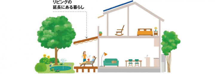 リビングならリビングで完結するのではなく、リビングの延長にある暮らしという考え方。