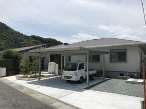 新築完成直後の状態です、駐車場スペースも広くとれる敷地で高低差もありましたので階段の踏み幅を広くとり