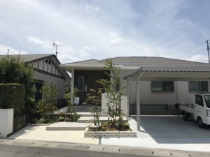 お客様のご要望で緑を玄関前に欲しいとの事で、両サイドに花壇を作り