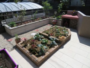 片方には菜園・ハーブ園のためのスペースを、作業のしやすいカウンターを設けました
