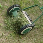 まずは小石を取り除き、手動芝刈り機で豪快に。芝刈りハサミで芝生の際など細かいところもきっちりと刈ります。