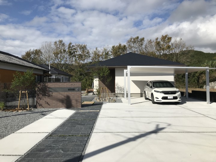 車庫は建物寄りに配置し、床面はコンクリートにて使い勝手良く。