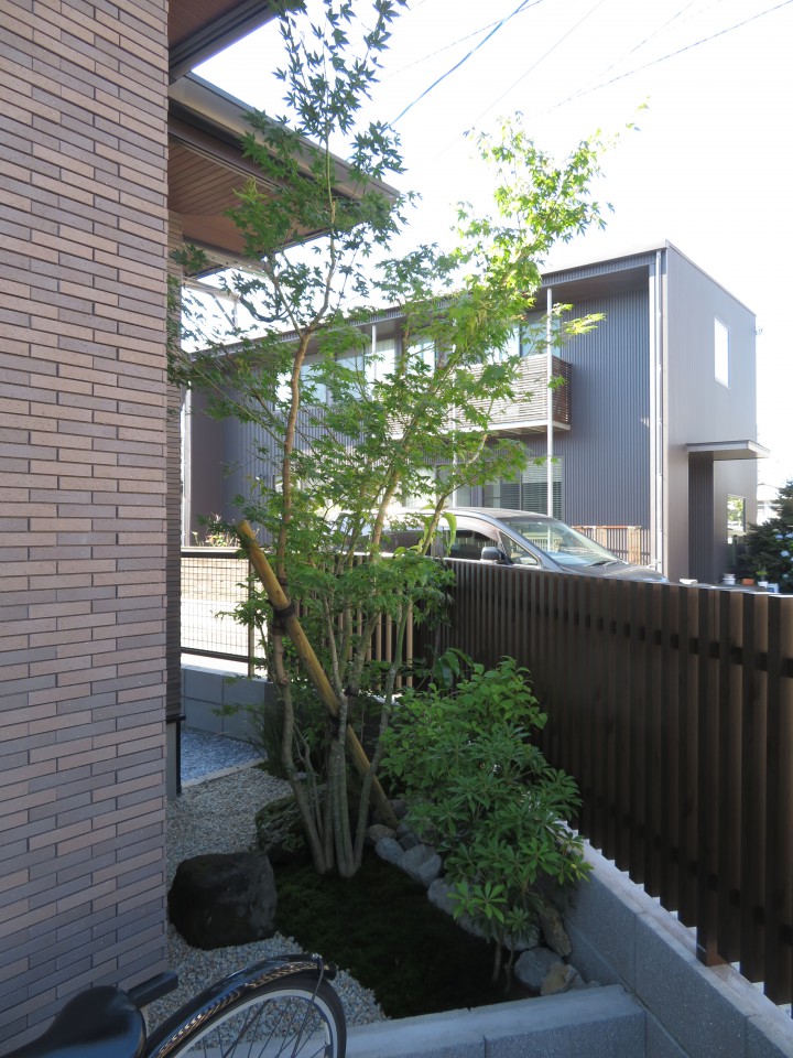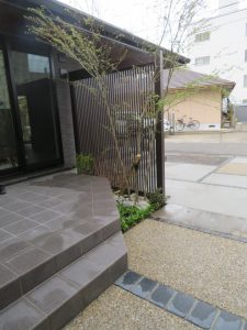 道路から見える坪庭のフェンスも格子で統一感を出しています
