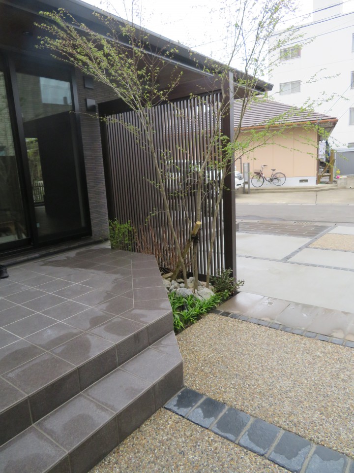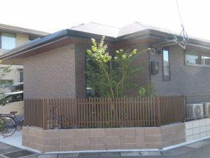 道路からタイルテラスで過ごす様子が見えにくいように、格子の大きなフェンスを付けました