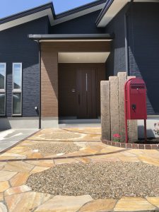 玄関周りを明るくし石張のアプローチにしたいとのご希望です