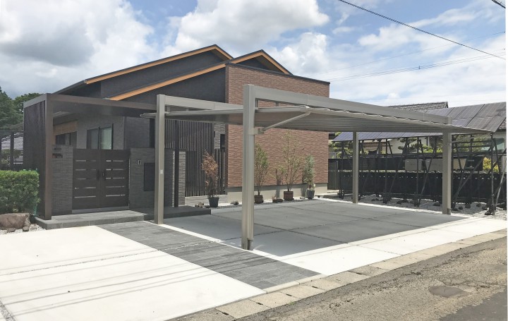 車庫にはスタイリッシュなカーポートを設置して豪華さを演出しています。
